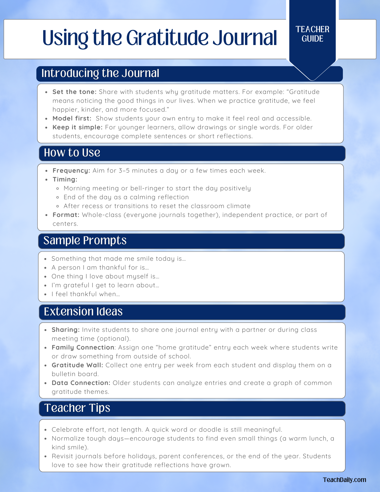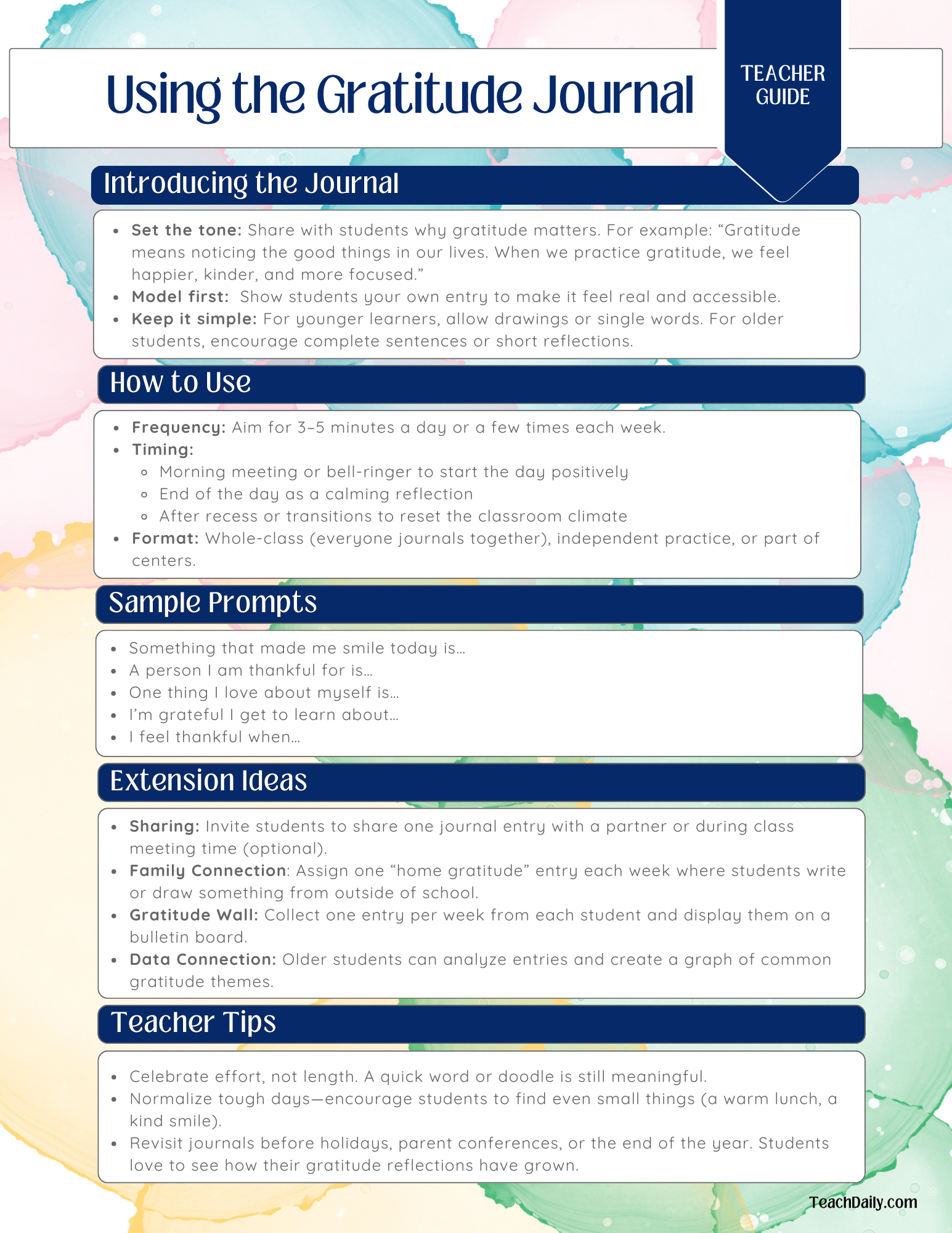 Download the journal, print copies for your students, and watch how a few intentional minutes of gratitude can shift the climate of your classroom.