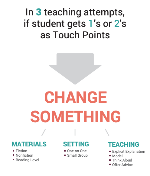 Touch Points also help us monitor the effectiveness of our instruction. If after three teaching attempts, a student has only 1s or 2s, we look at our instruction and change something. We evaluate the