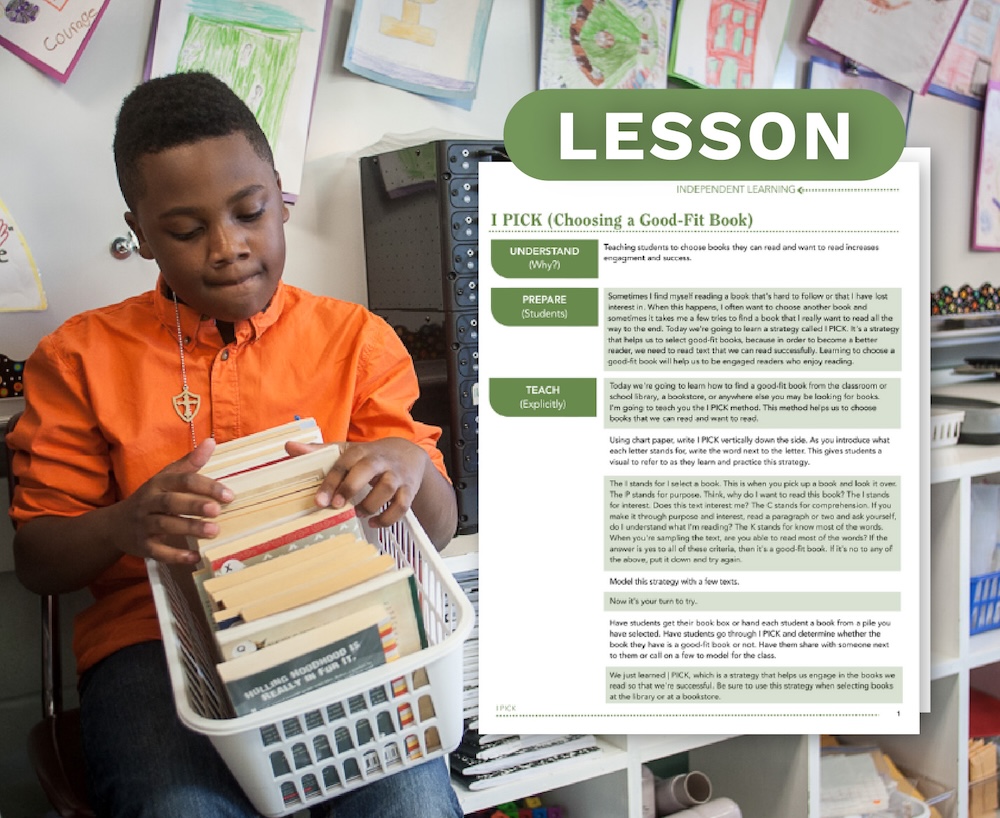 This ready-to-teach lesson helps students learn the IPICK strategy for choosing “good-fit” books that match both their reading ability and interests.