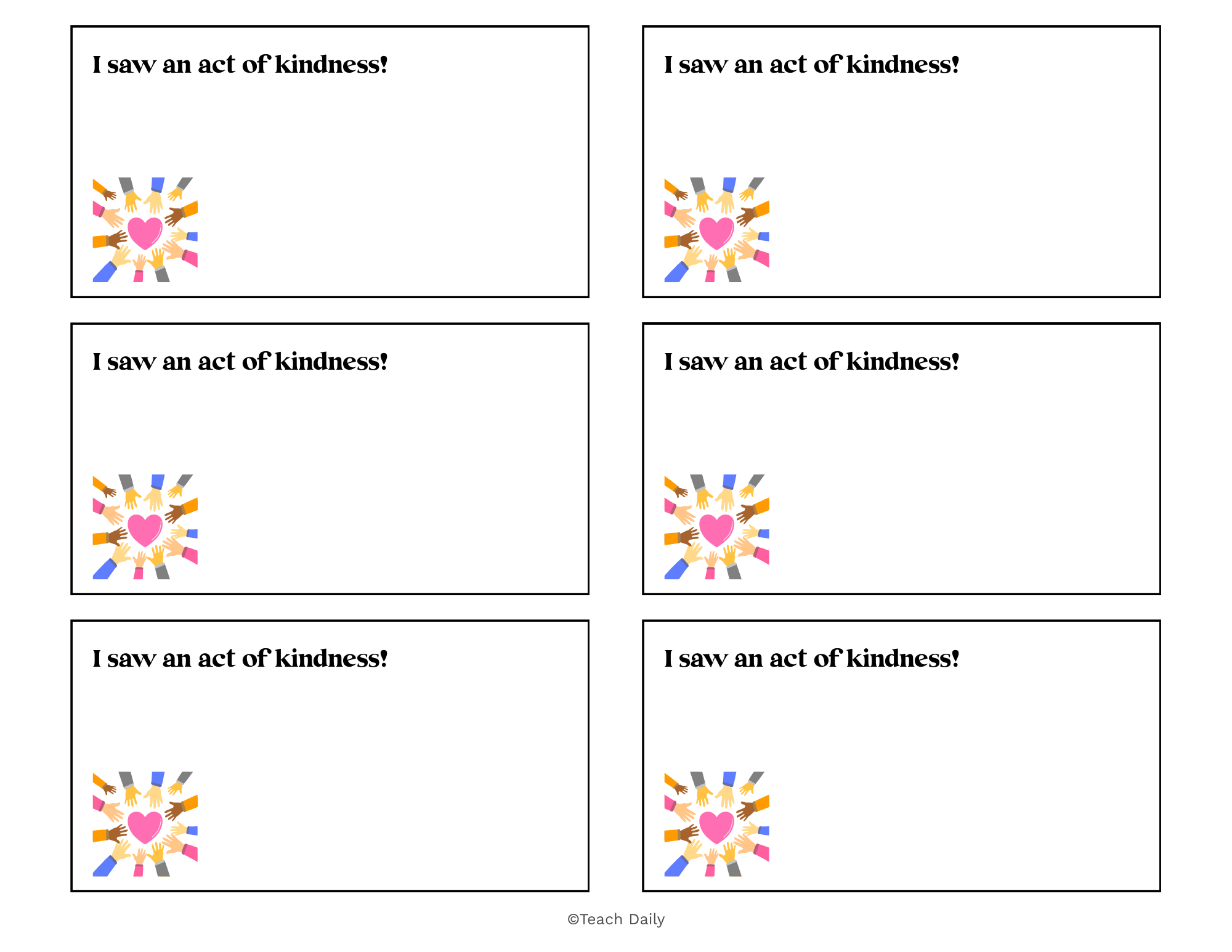 Create a Kindness Chain by having students write or draw acts of kindness they notice or perform on paper strips. Each time an act of kindness is recorded, add a link to the chain and display it in the classroom to visually show how kindness grows and connects the community. Use the chain as a reflection tool during meetings or closing circle to reinforce positive behavior and empathy.