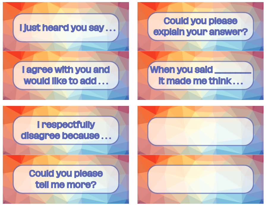 Use this lesson to introduce the concept of respectful communication to your students. Then, view the respectful communication stems below to print and post in your room, or create some of your own!