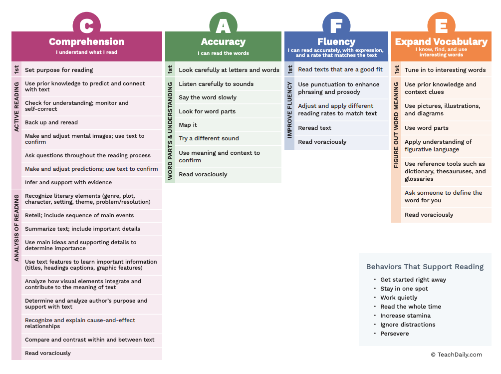 The CAFE Menu has four columns, each of which represents one of the four key components. In each column you will find some of the most commonly used reading strategies in each of the four areas. The menu filled with strategies can be found in The CAFE Book and on the Daily CAFE website.